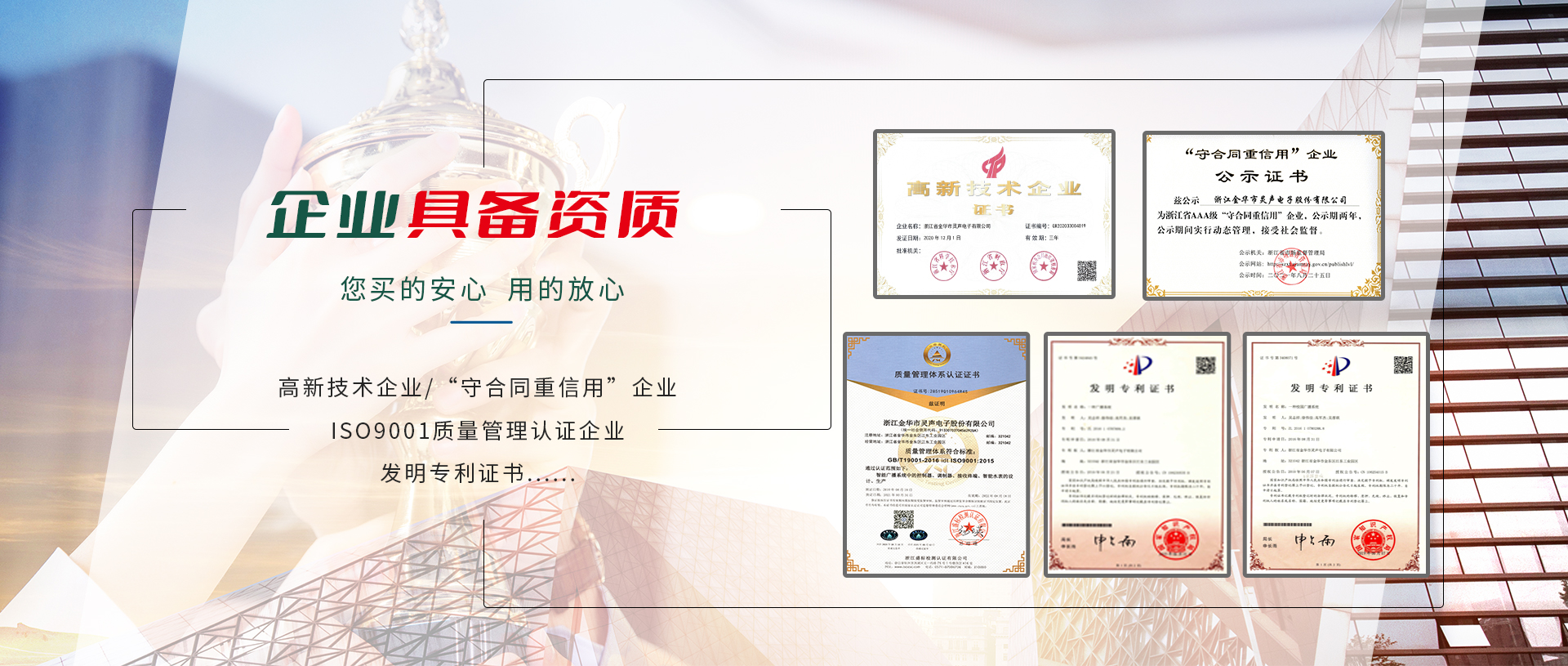 公司2001年通過ISO9001:2008國際質(zhì)量管理體系認(rèn)證、ISO14001:2004環(huán)境管理體系認(rèn)證,相關(guān)產(chǎn)品通過國家CCC認(rèn)證及CQC產(chǎn)品質(zhì)量認(rèn)證,并通過國家廣播電影電視新聞出版總局廣播電視設(shè)備器材入網(wǎng)認(rèn)可。公司注重產(chǎn)品的質(zhì)量與技術(shù)創(chuàng)新,現(xiàn)建有多條先進(jìn)的總裝、檢測流水生產(chǎn)線及各項檢測設(shè)備所需的儀器設(shè)備。還擁有全電磁屏蔽室一個,所有高頻產(chǎn)品的調(diào)試均在屏蔽室中進(jìn)行。公司組建了高素質(zhì)的管理隊伍,設(shè)有研發(fā)部、生產(chǎn)部、銷售部、采購部、質(zhì)檢部、售后服務(wù)中心及財務(wù)部等部分,并與國內(nèi)多家大專院校、科研單位建立長期合作關(guān)系,成立了近乎是技術(shù)研發(fā)中心,是金華市職業(yè)技術(shù)學(xué)院重點示范實習(xí)基地。公司產(chǎn)品先后被浙江、江蘇、重慶、四川、甘肅、山東、湖南、湖北、貴州等文廣新局、電視臺、氣象局普遍采用,覆蓋全國各省市800多家縣(市)文廣新局、廣播電視臺,并廣泛采用于教育行業(yè),尤其是在近年來的農(nóng)村應(yīng)急廣播“村村響”工程中,靈聲公司中標(biāo)承建的“村村響”工程贏得了各省市廣播電視劇領(lǐng)導(dǎo)、專家們的一致好評!